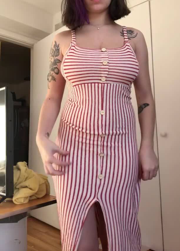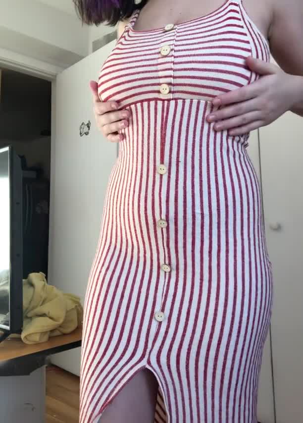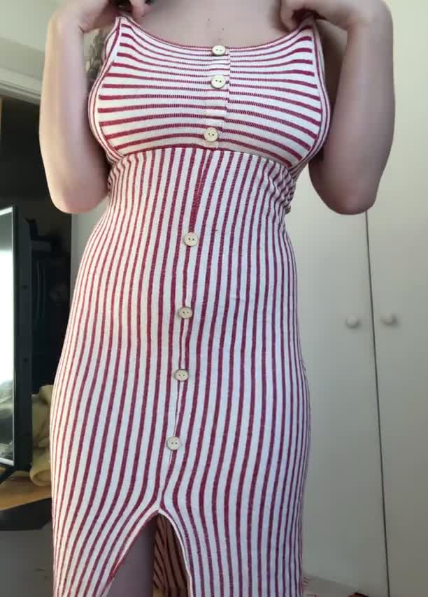 Чудесная девочка делится видом своей прекрасной груди, опуская верх платья.