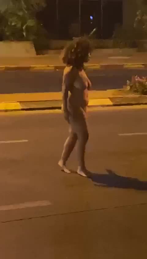 Голая пухлая деваха гуляет с криками по улицам ночного города.