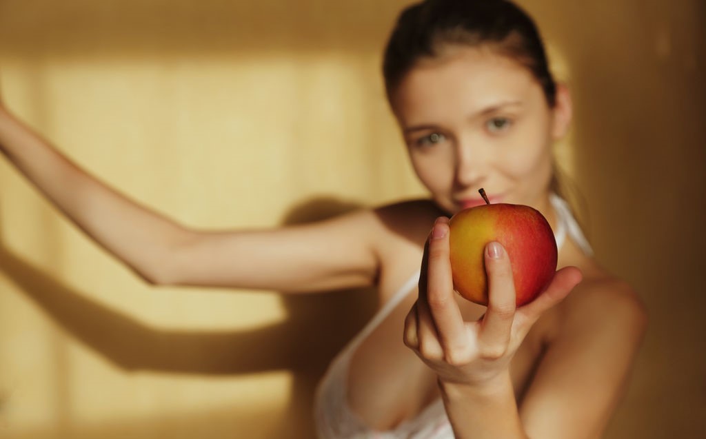 Красивая девочка-подросток показывает свои большие сиськи и лысую киску пока ест фрукты
