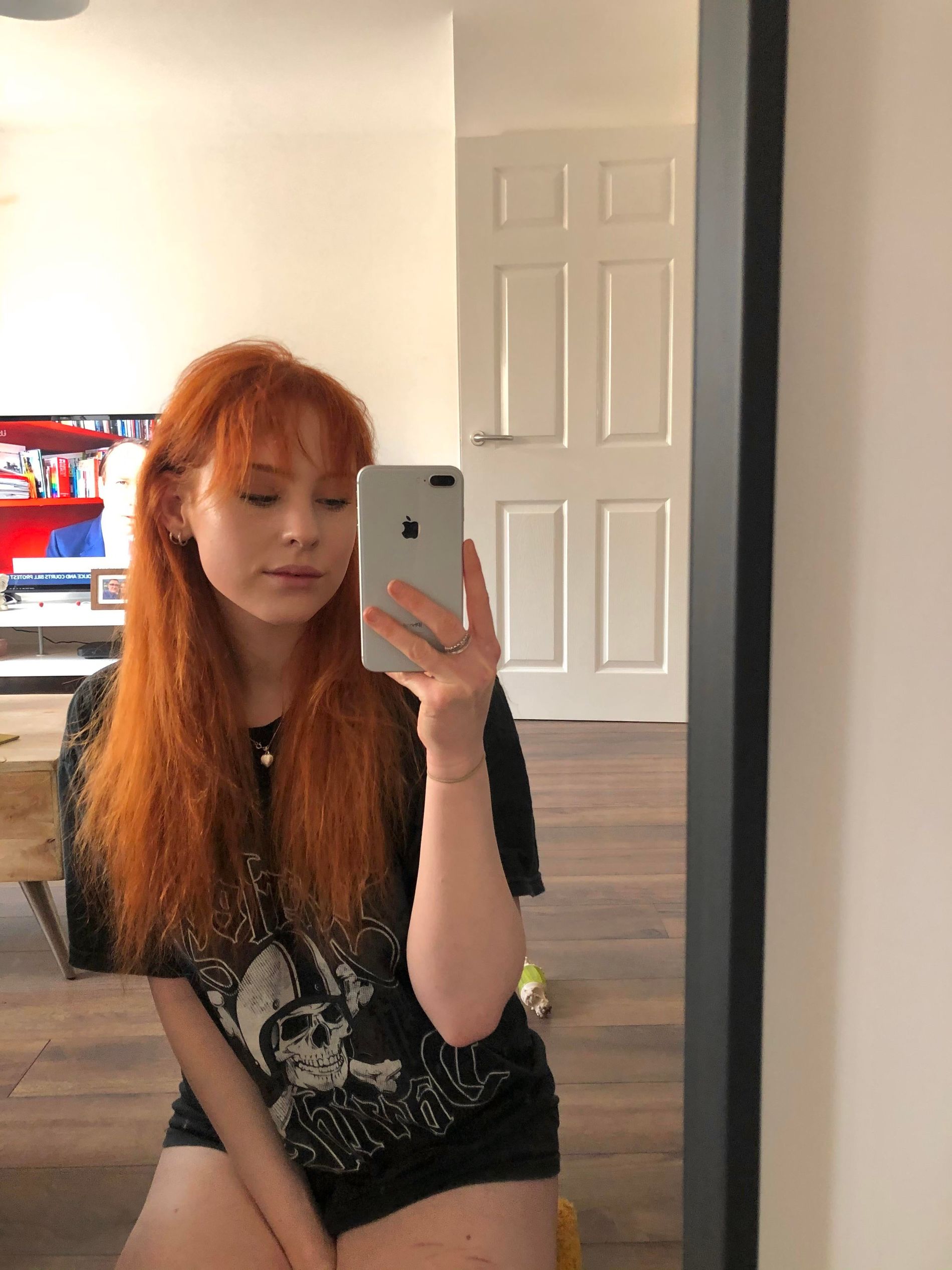 рыжеволосая себяшница демонстрирует себя в одежде и обнажённой, и показывает свою киску