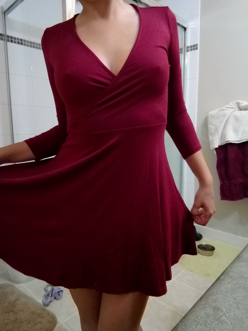 эротично красуется в платье бордового цвета заголяя свои привлекательные прелести