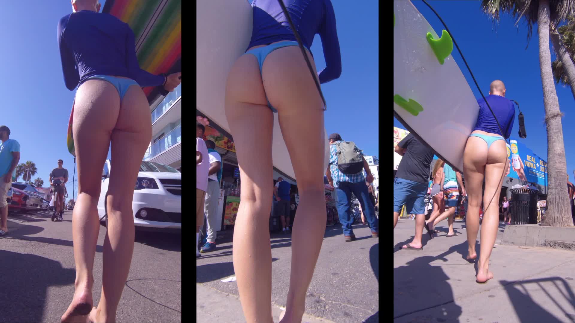 девушка гуляет к голубом купальнике показывая свою красивую попку