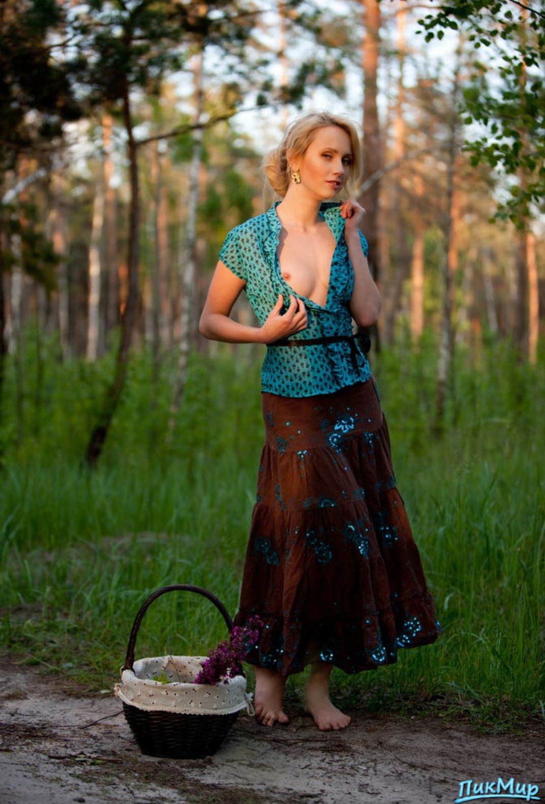 Лесная фотосессия стройной блондинки с корзиной