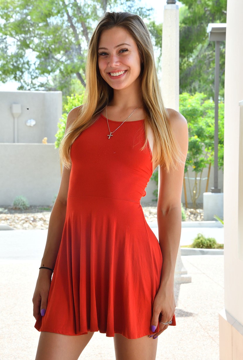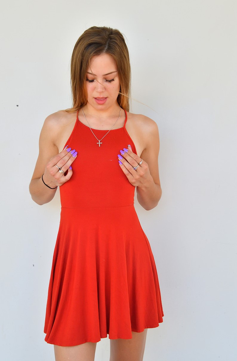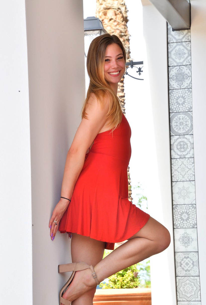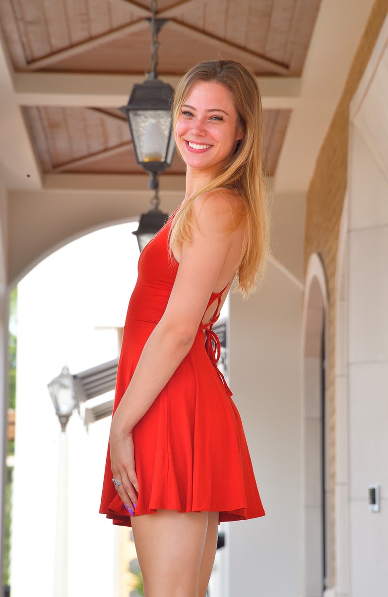 Очаровательная юная красотка в красном платье светит задницей и киской