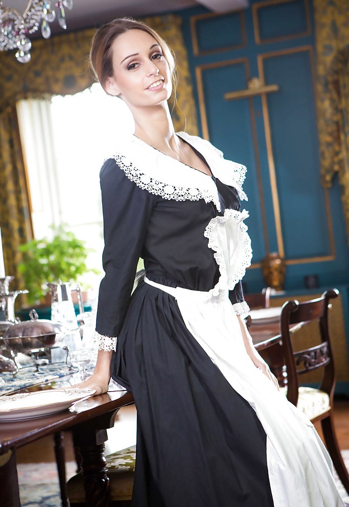 Горничная красотка засветила бедра и подвязки перед тем, как разделась догола
