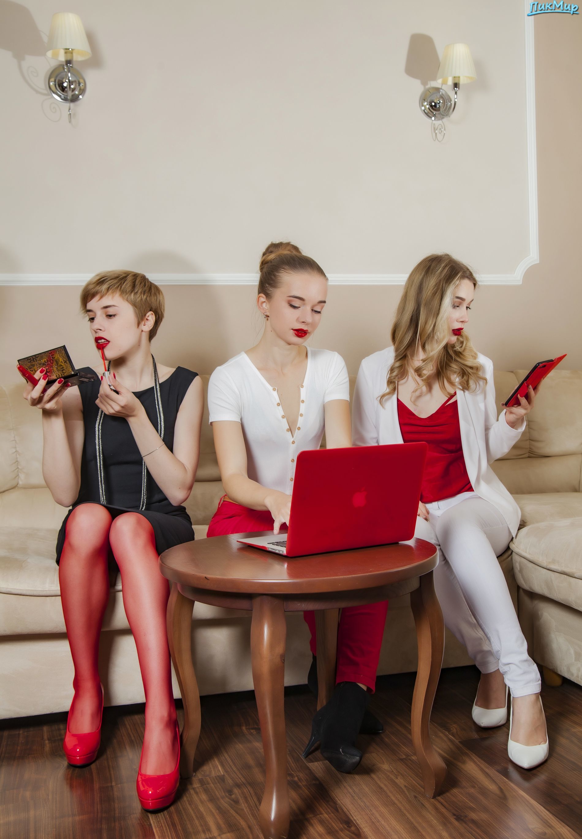 Молодая девушка, - Милена Ангел, со своими подружками, демонстрирует свои прелести в разных позах. Одна из девушек, позирует в чулках.