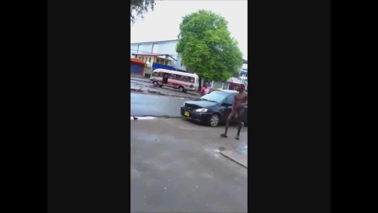 Негр с большим членом гордо ходит голым по улице.