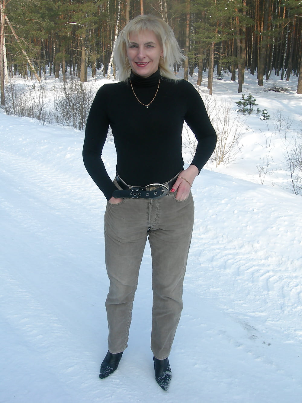 Дамочка в мороз разделась на лесной дороге. Видно холода она не боится.