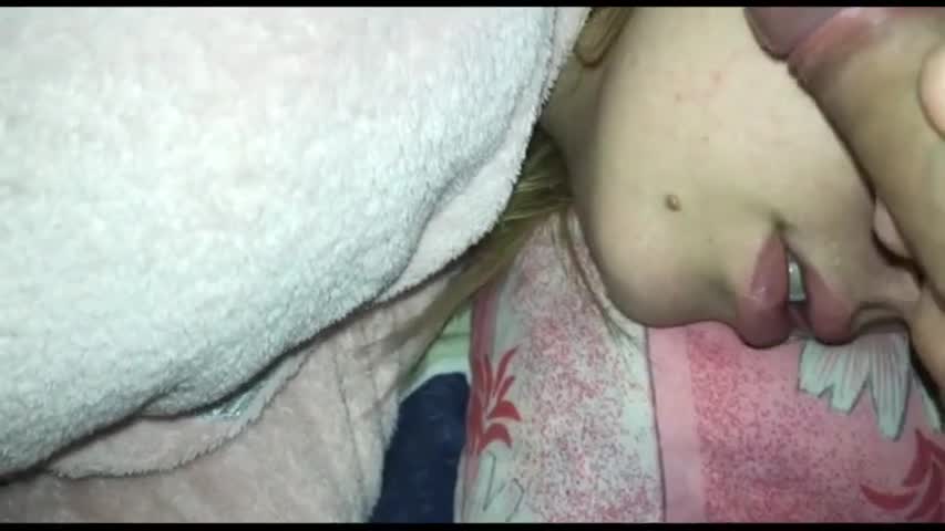 Пацан без лишних слов достал член из штанов и запустил его за щеку спящей подружке. Она инстинктивно стала посасывать знакомую ей штучку, в итоге вышел классный отсос от блондинки.
