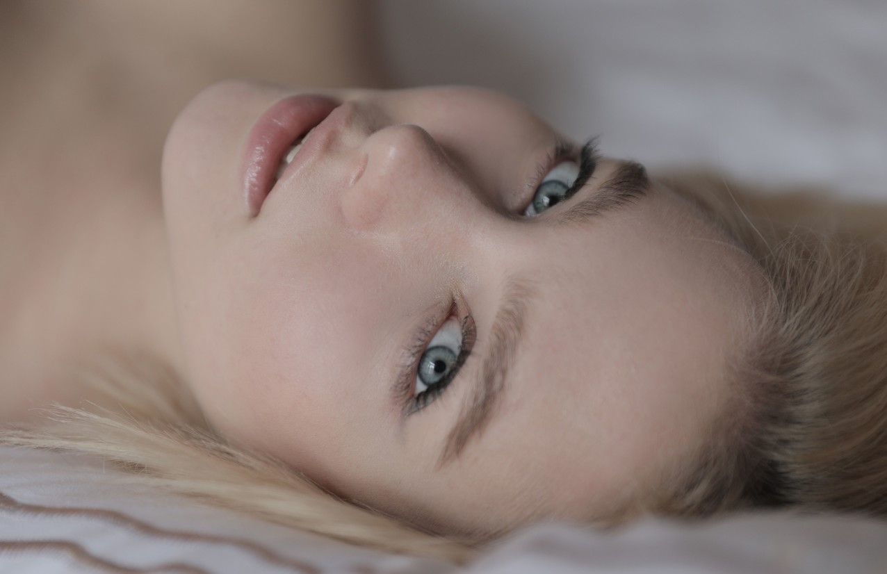 Сладкая блондинка с горячим телом раздевается и позирует на кровати