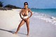 Черноволосая красотка с очень большими сиськами гуляет по пляжу.