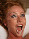 Много спермы на лице симпатичной и радостной рыжеволосой красотки.