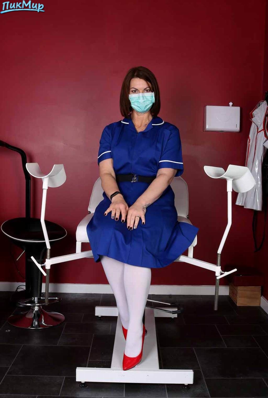 Красивая зрелая брюнетка позирует у гинекологического кресла в белых чулочках