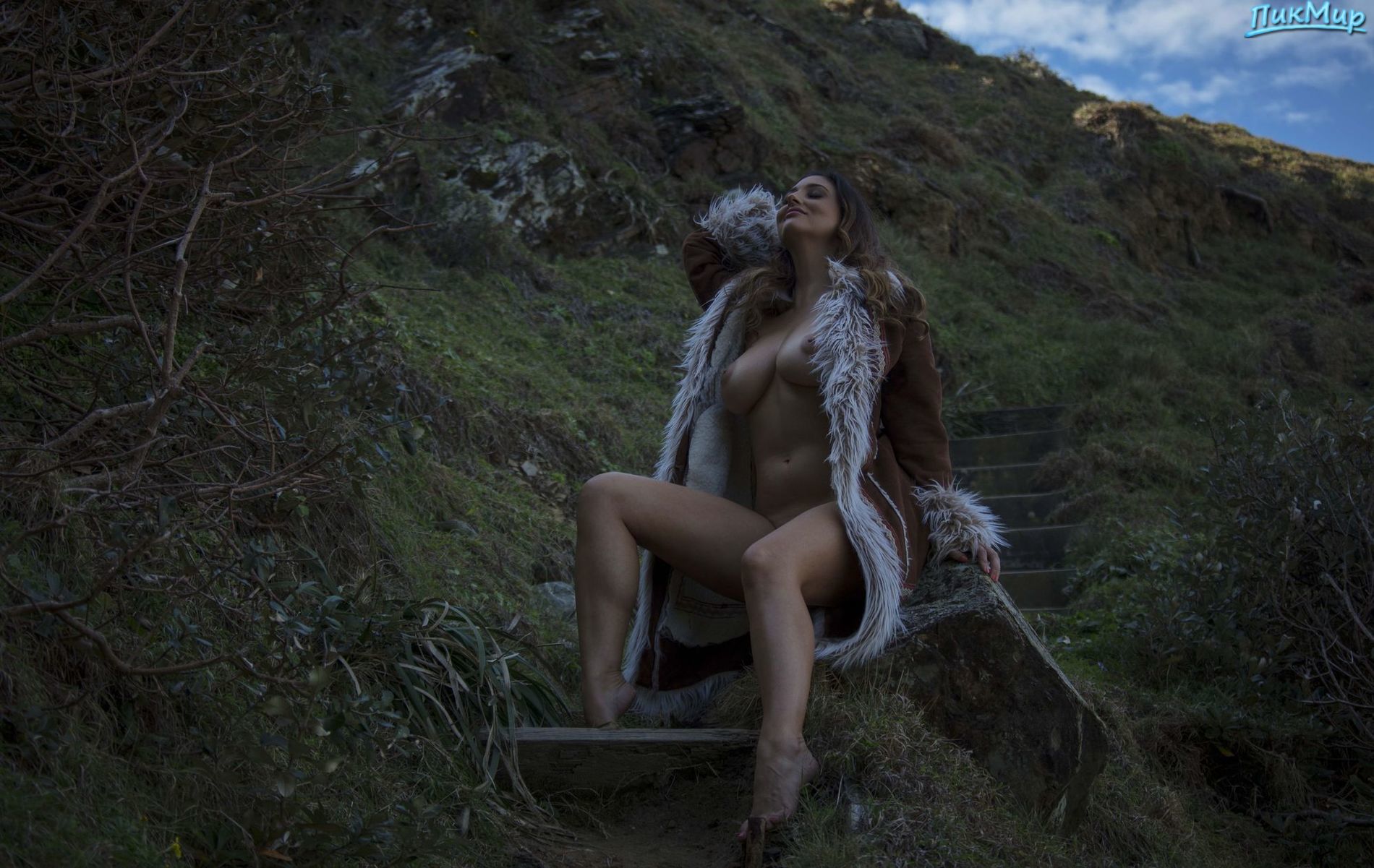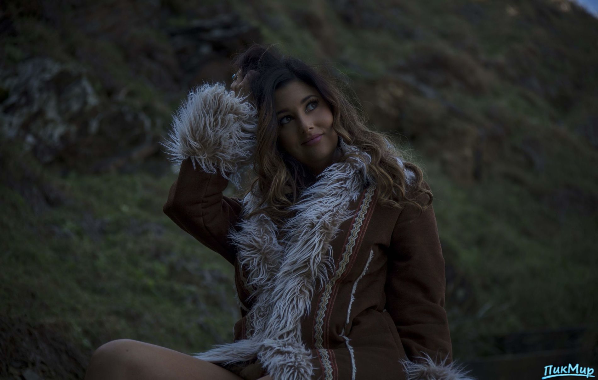 Ингрид позирует на зелёном склоне горы , в одной шубке