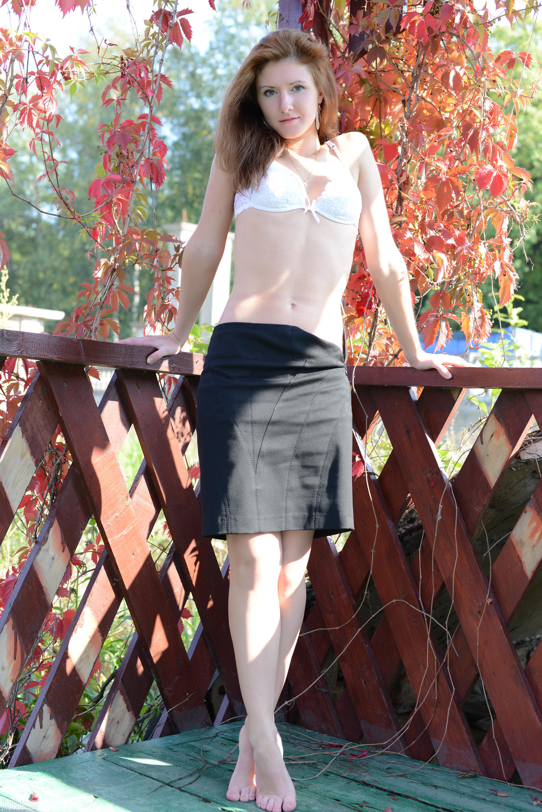 Красивая брюнетка медленно раздевается на открытой веранде около пруда