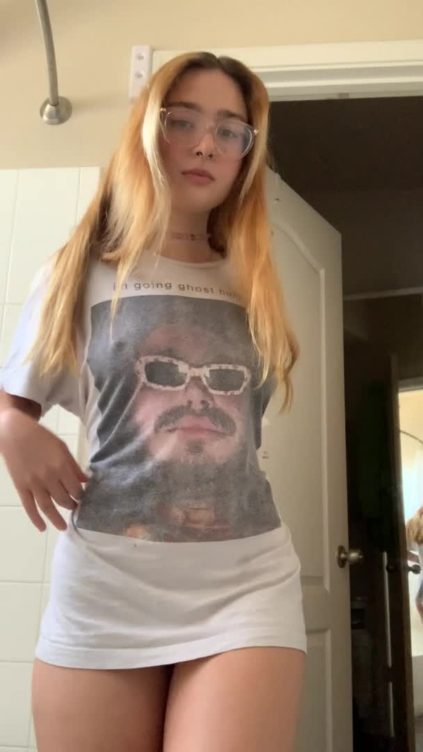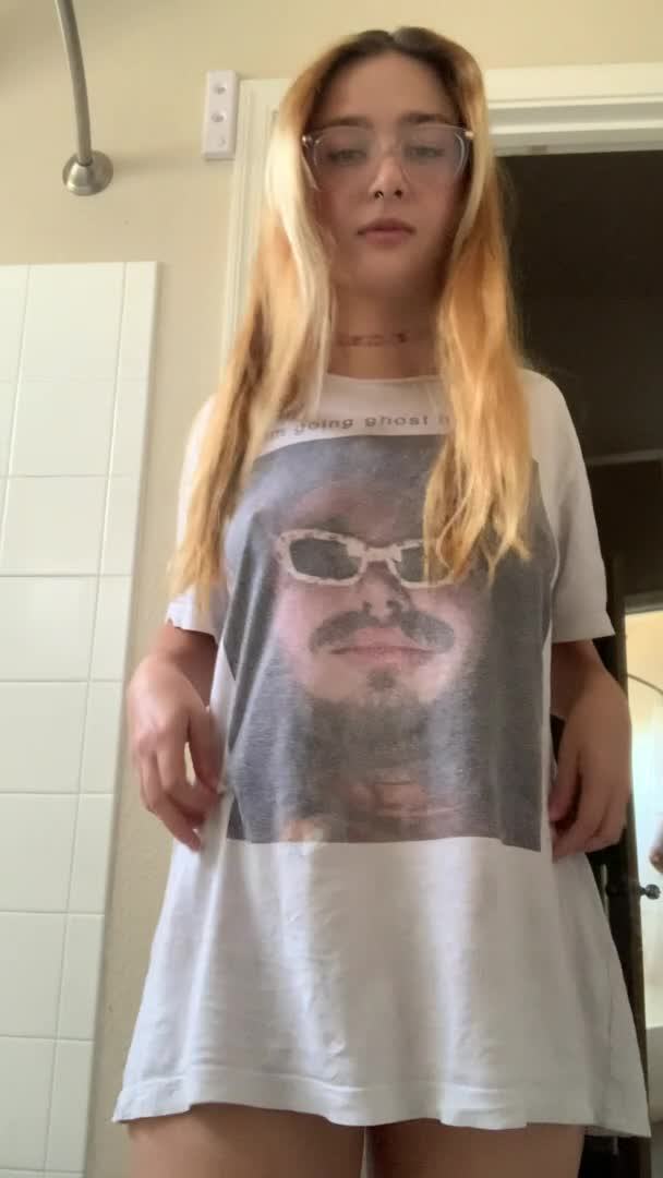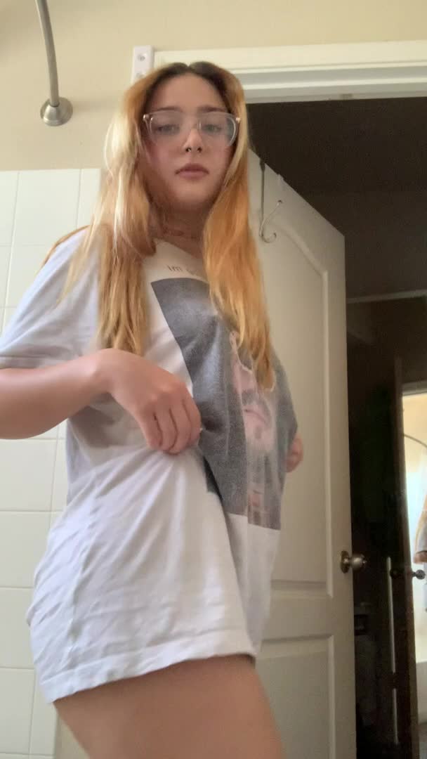 Всё красиво и очень привлекательно под футболкой у этой девушки в очках!