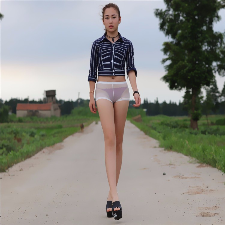 Симпатичная модель с Китая красиво позирует в белых прозрачных шортиках.