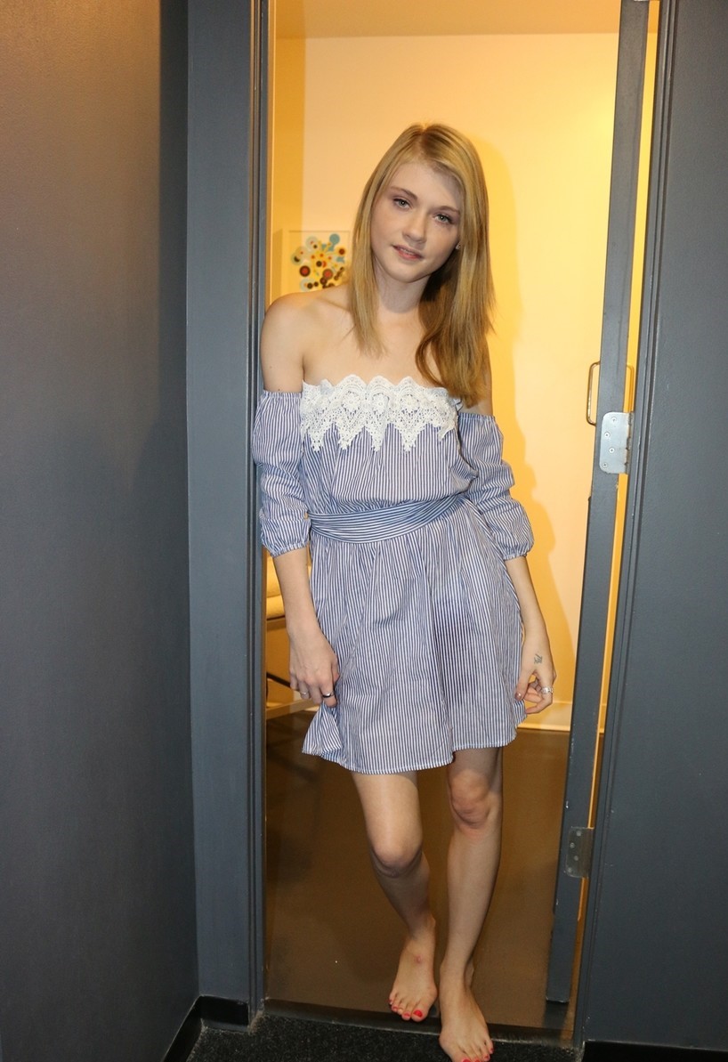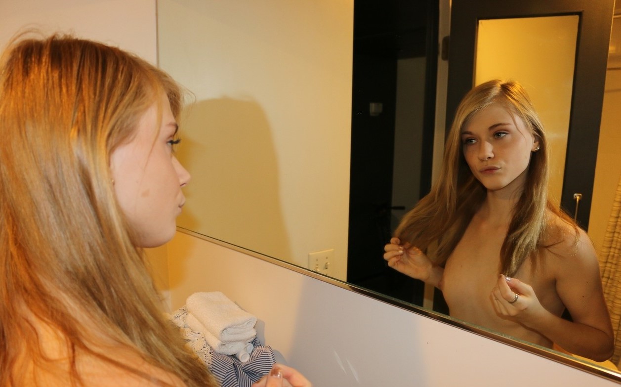 Миниатюрная блондиночка Ханна Хейс раздвигает пальцами свою влажную киску на унитазе
