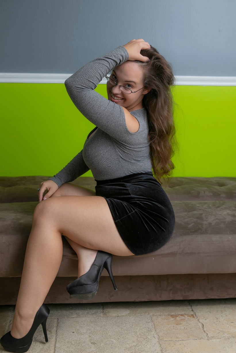 Пухлая Софи снимает одежду и очки, чтобы позировать обнаженной
