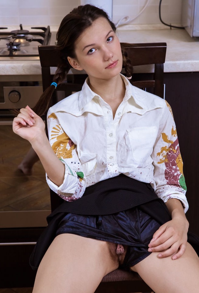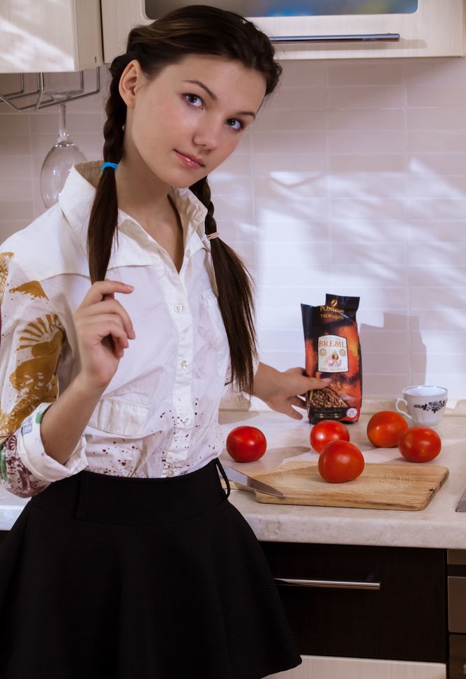 Симпатичная тинка готовит обед, когда ее киска возбуждается, поэтому она раздевается догола