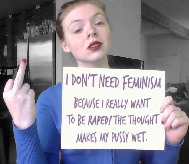 "Мне не нужен феминизм! Потому я реально хочу, чтобы меня изнасиловали. От этой мысли моя пизда течёт" - надпись на первой фотке