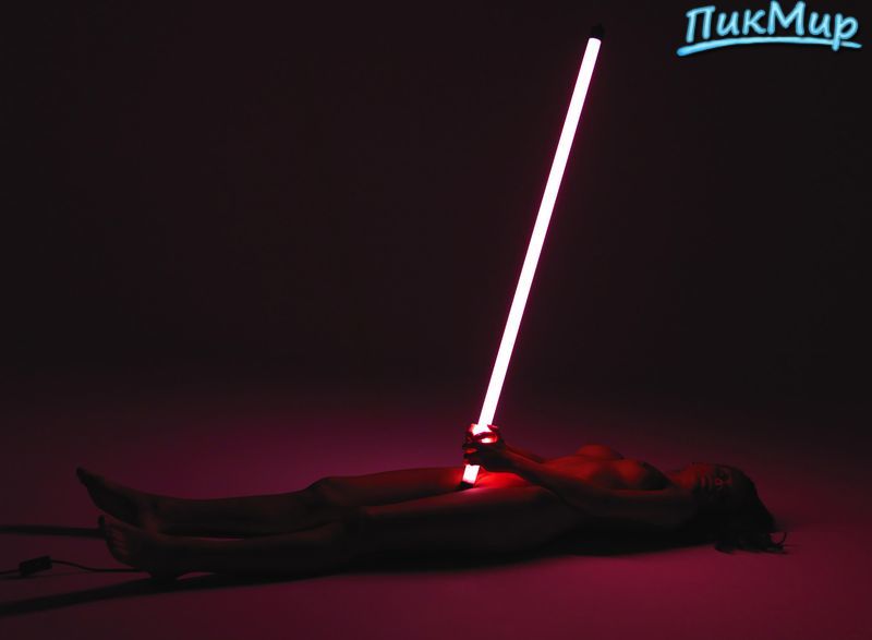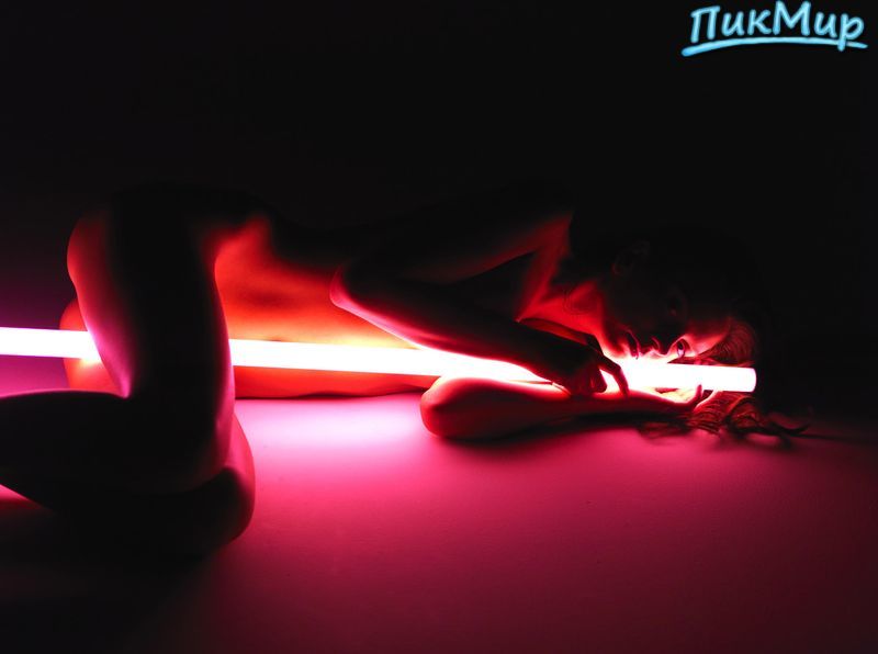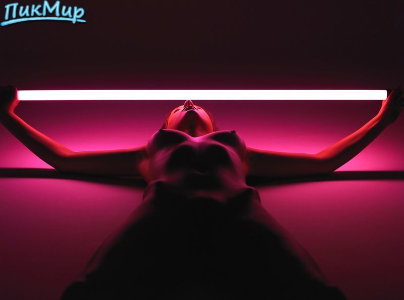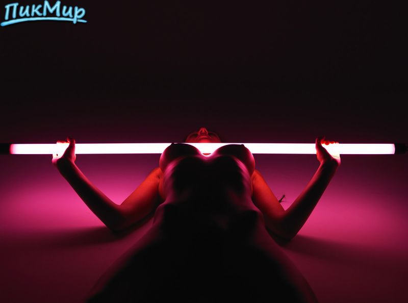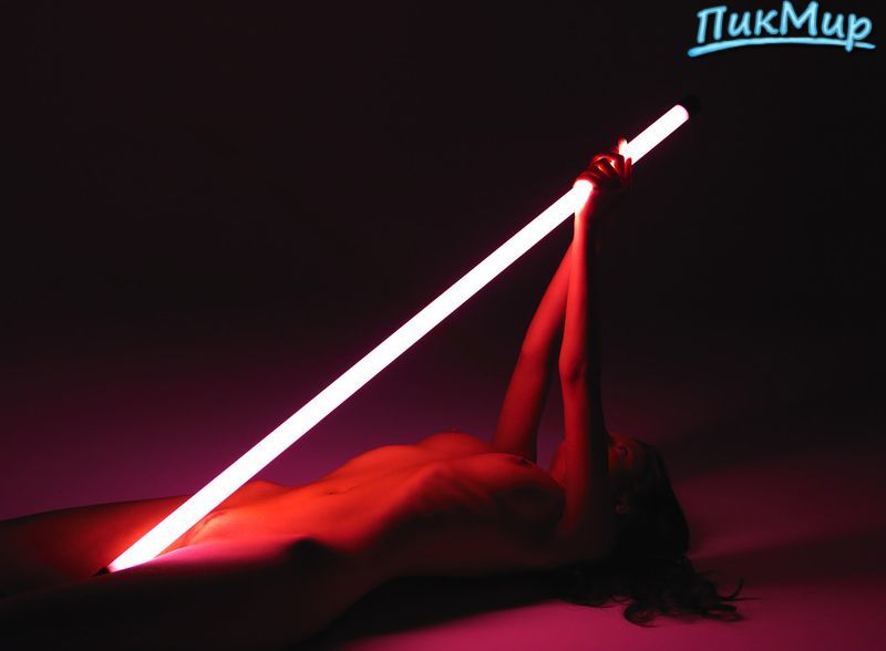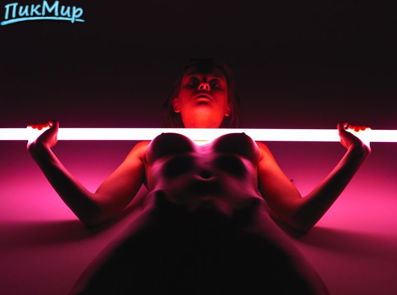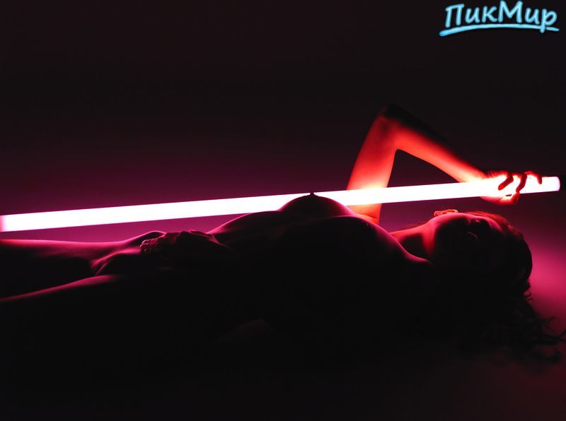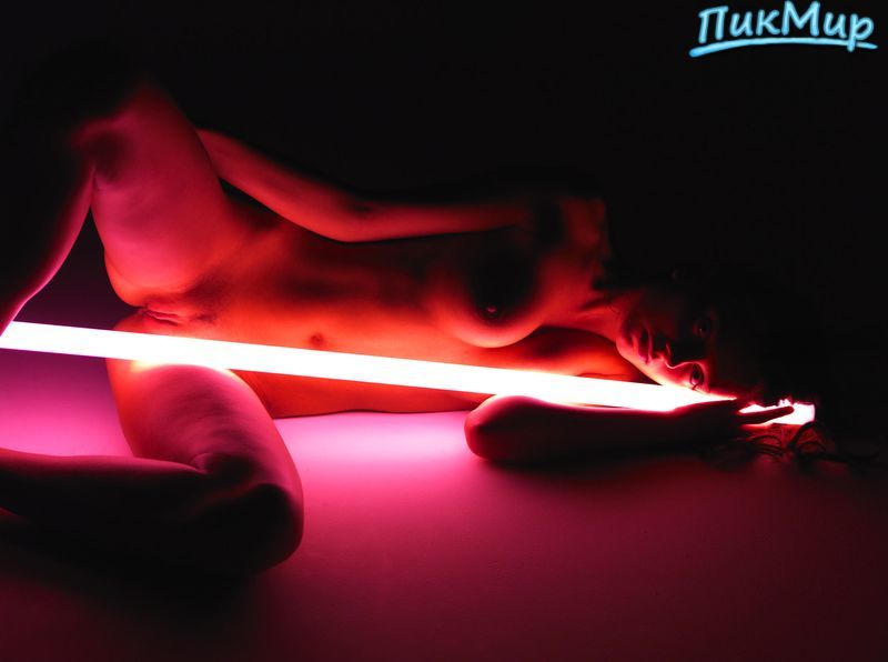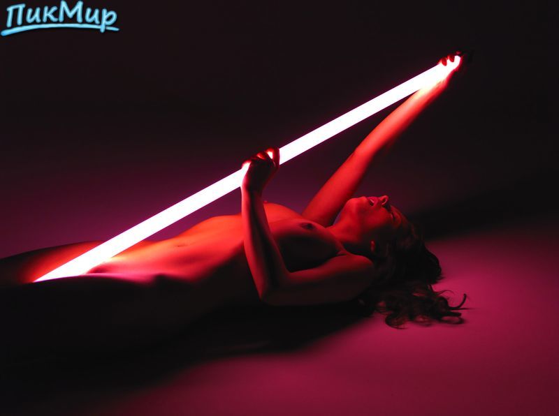 Девушка со спортивным телом позирует обнаженной с длинной лампой для большего эффекта.