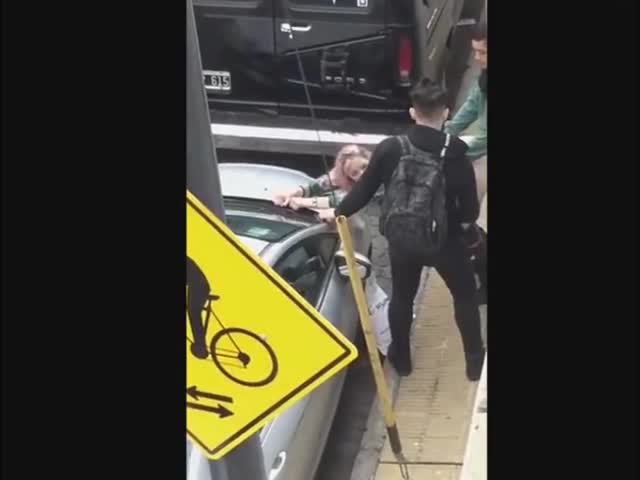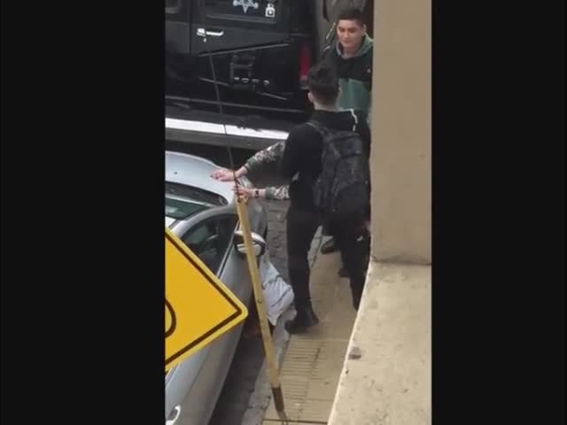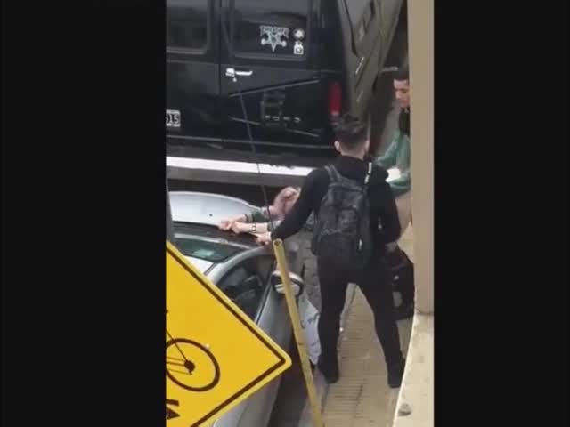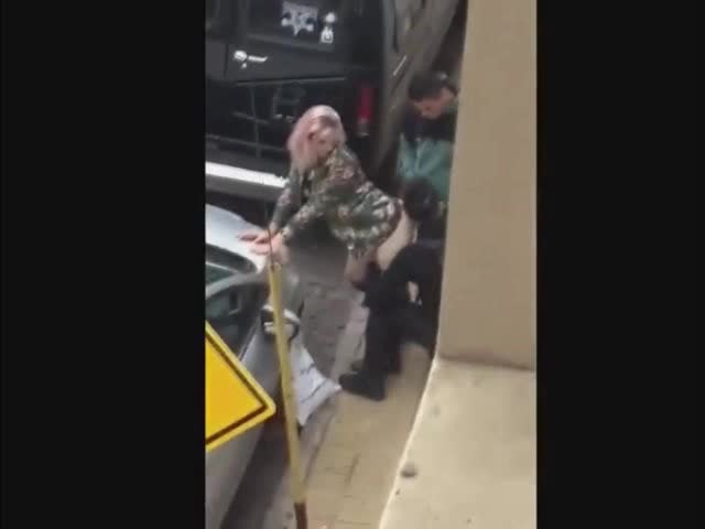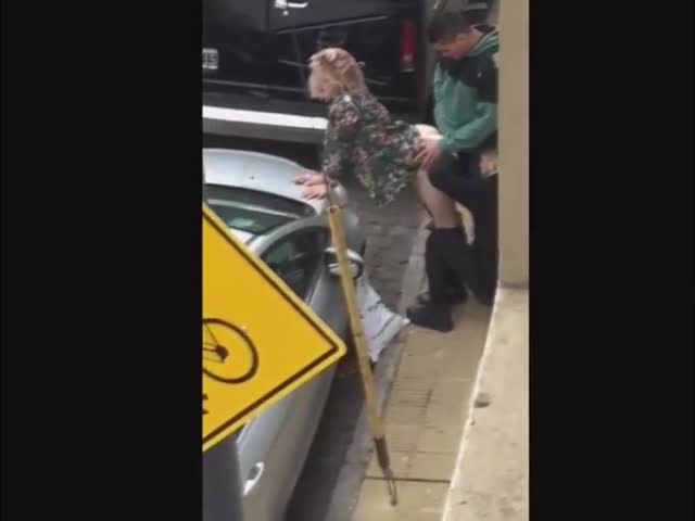 Два парня трахают пьяную блондинку прямо на тротуаре рядом с припаркованными машинами.