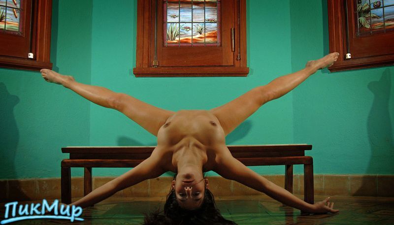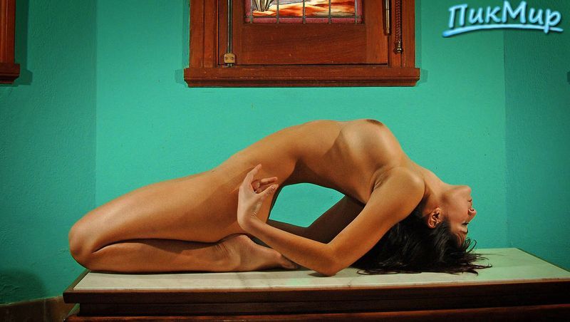 Обнаженная девушка с шикарными формами демонстрирует позы йоги.