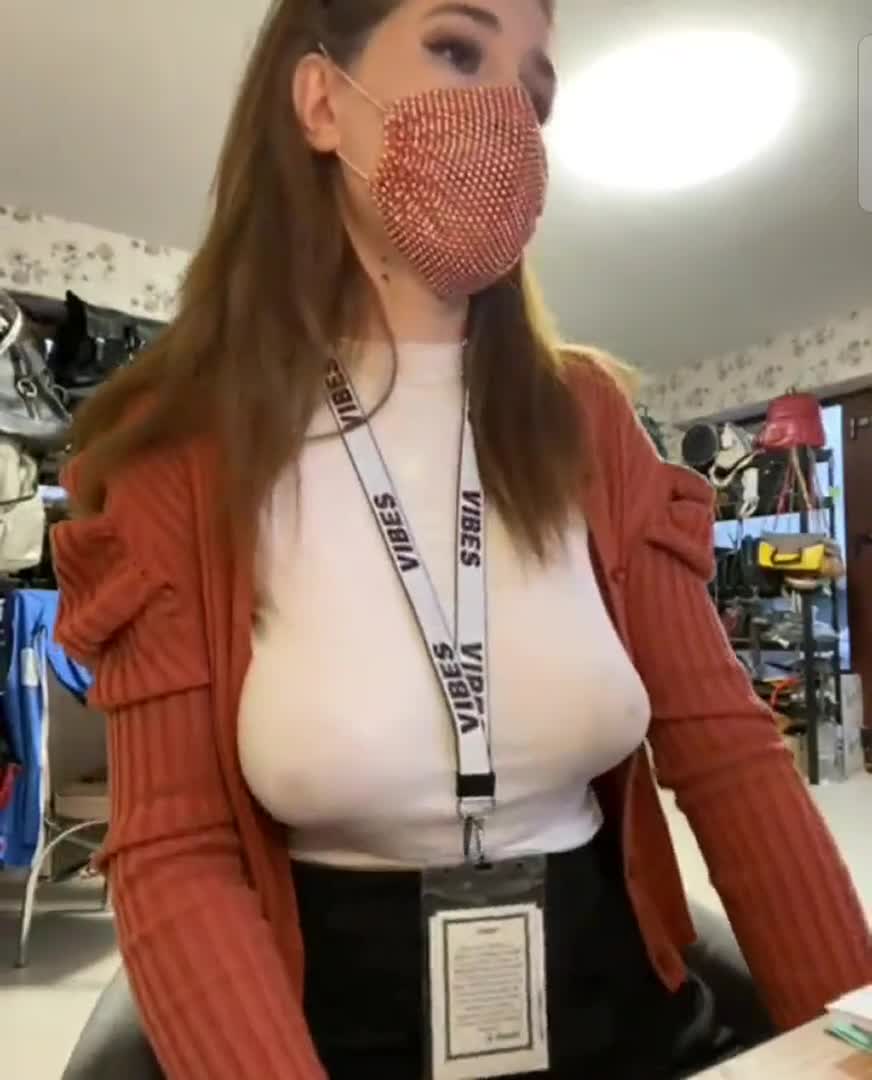 Девочка в магазине светит своими большими сиськами на вэб камеру.