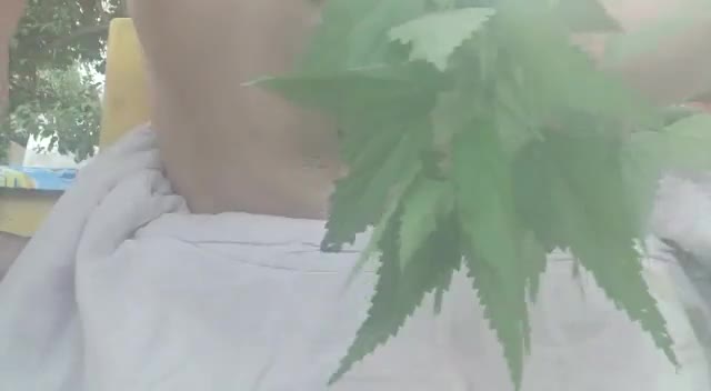 Женщина в возрасте бьёт себя по бритой писечке крапивой и записывает на видео!