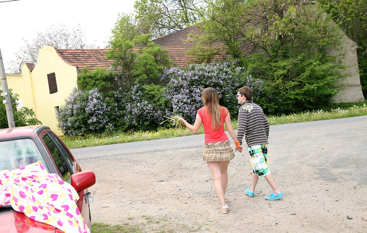 Длинноногая сексуальная тинка в коротком платье трахается на улице и ради камшота на животик