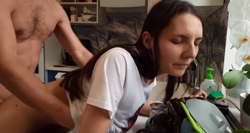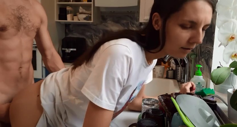 Мужик ебет свою красотку на кухне, фистит и кончает ей на лицо.