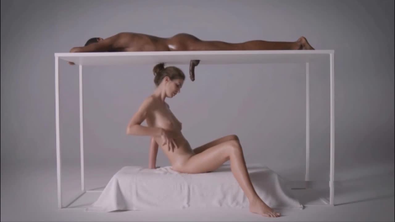 Красивая, стройная, обнаженная женщина делает страстный, нежный и длинный массаж руками и языком большому члену черного мужчины, пока он не канчает ее на сиськам.