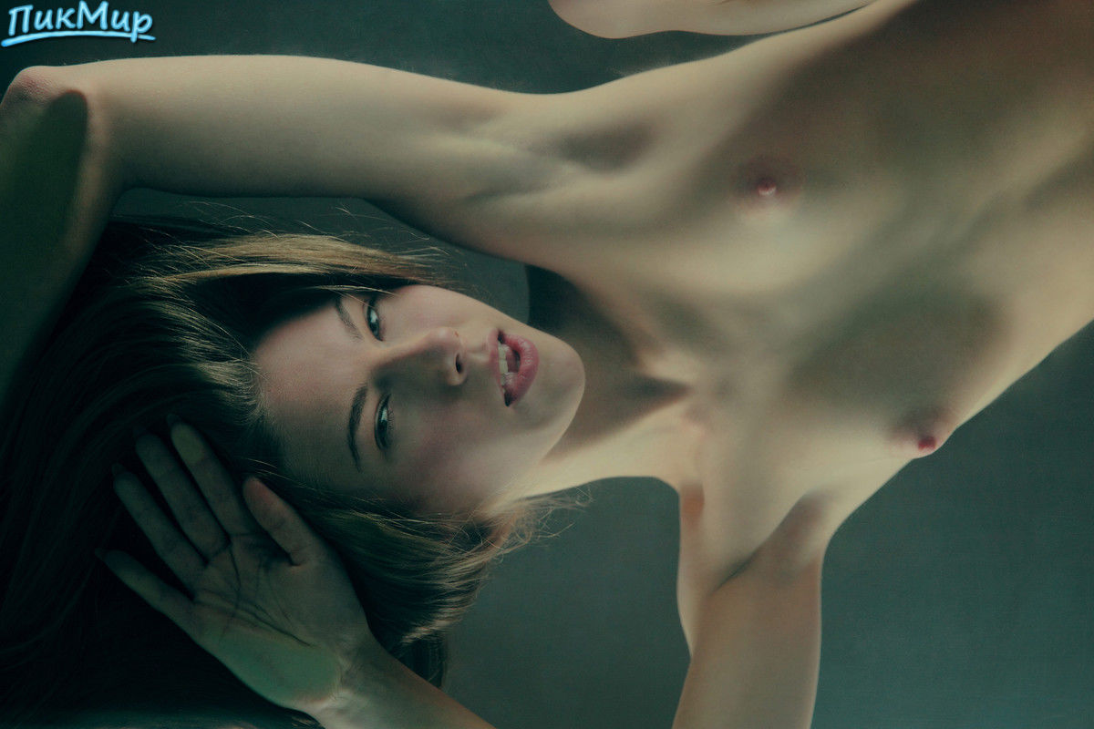 фотосессия молодой девушки с красивыми сиськами и чисто выбритой киской, лежащей на стекле и сфотографированной снизу, создающей эффект, как будто она плавает в воде.