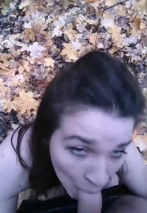 Подруга гуляя в осеннем лесу разделась и отсосала своему парню.