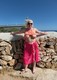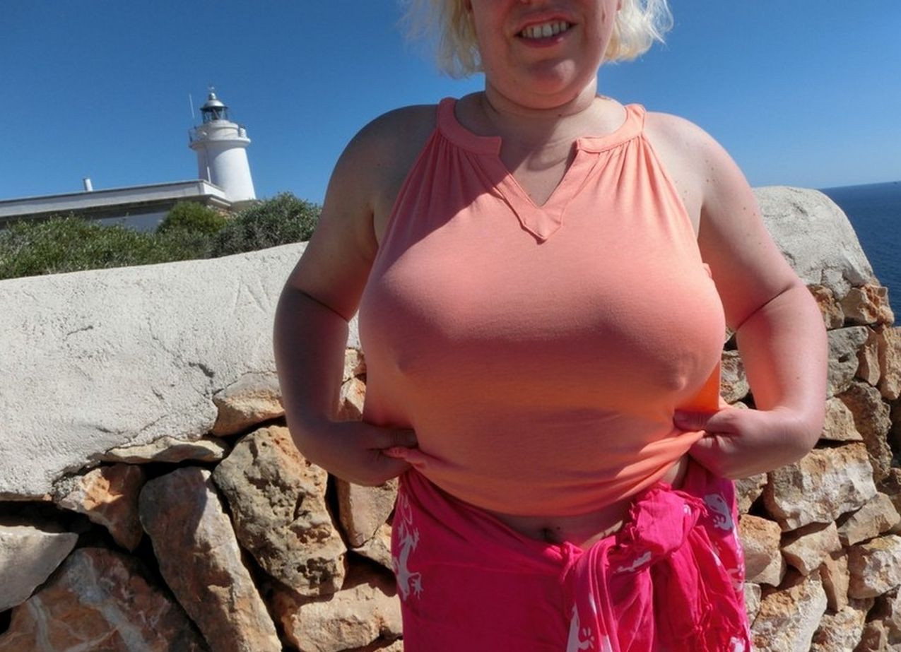 Пухлая женщина раздевается во время посещения испанского туристического объекта