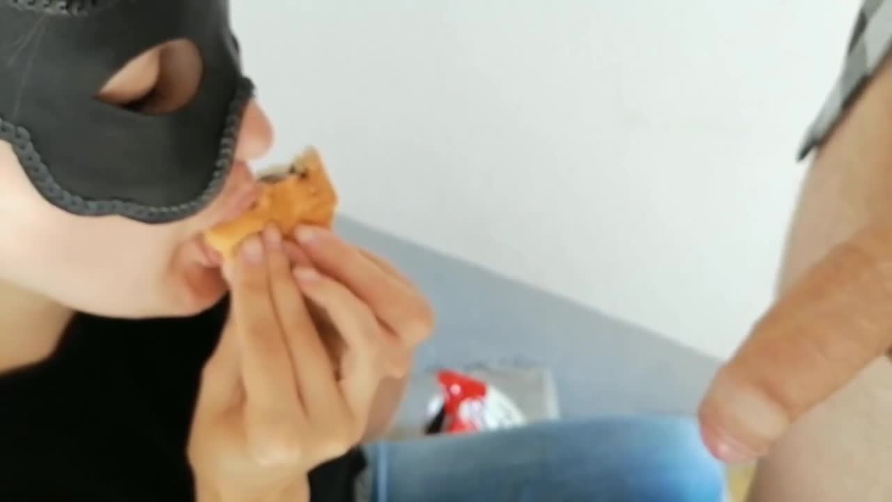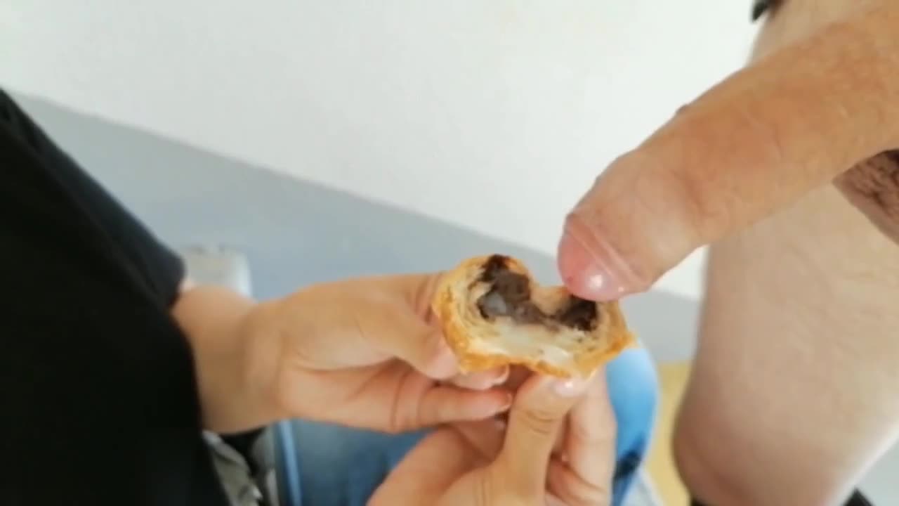 Девушка сделала приятно парню и за одно и перекусила необычным круассаном).