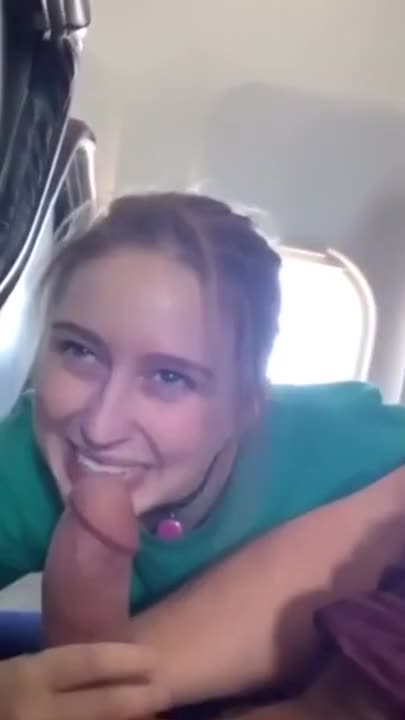 Девушка с радостным лицом делает минет своему парню в самолёте.