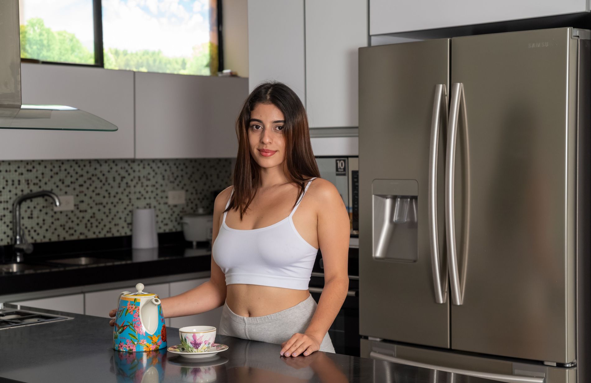 Девушка по имени Ангелина позирует на кухне