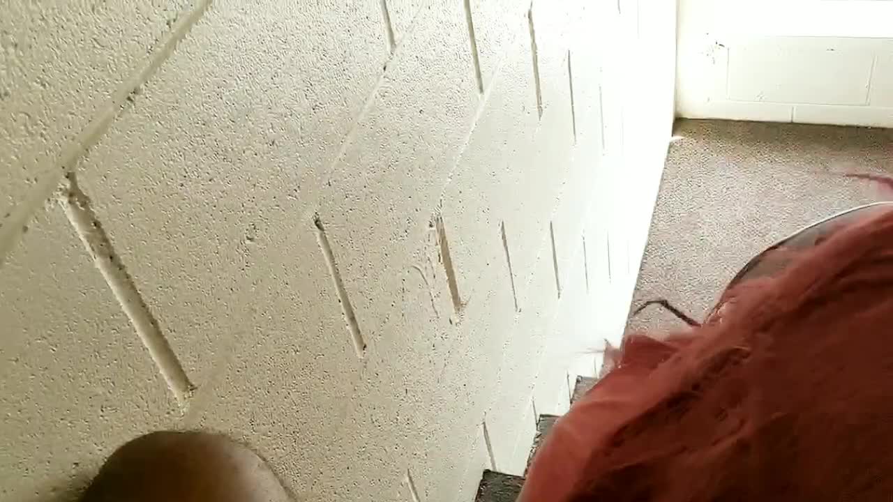 Белая девка сосёт болтяру своему черному другу, прямо на лестнице.