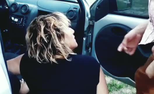 Дамочка встала рачком у машины, из двери. И подставила под член свою щелку. Мужик влупил ей и кончил на жопку.