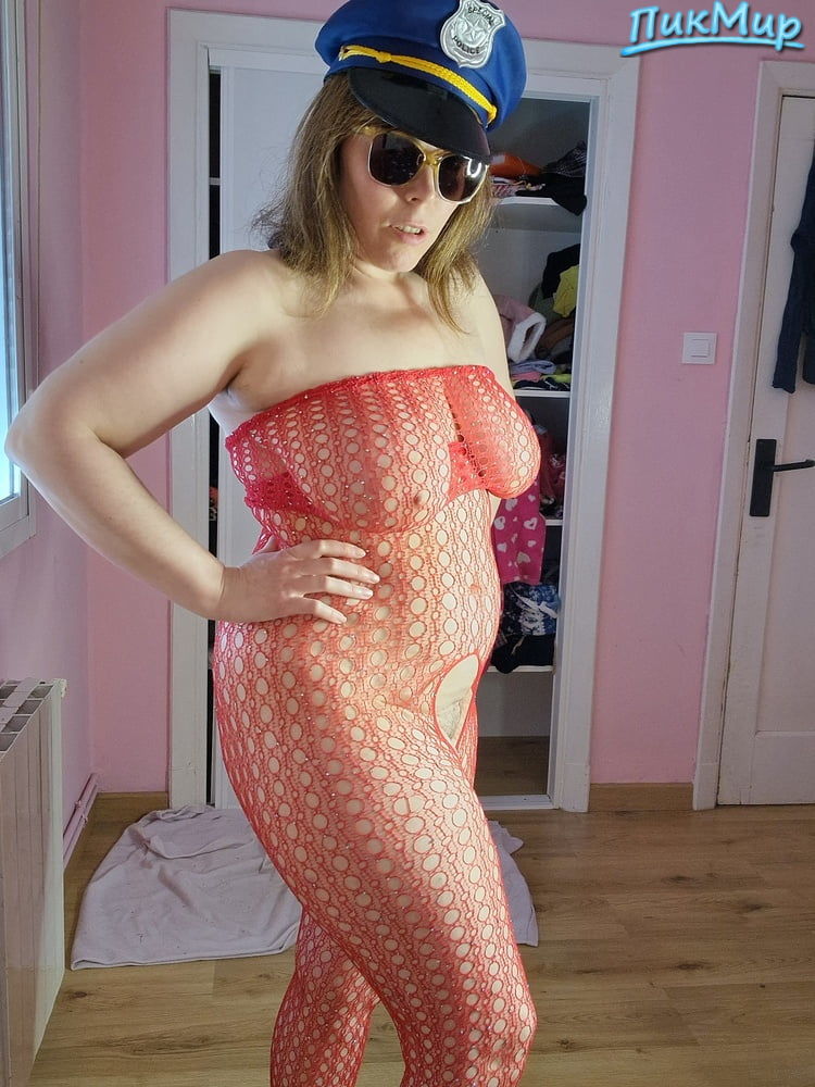 Женщина позирует в фуражке полицейского и сетке и просто дома