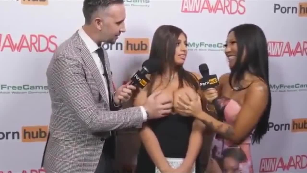 На красной дорожке порнопремии AVN ведущие дурачутся с сиськами порноактрисы.