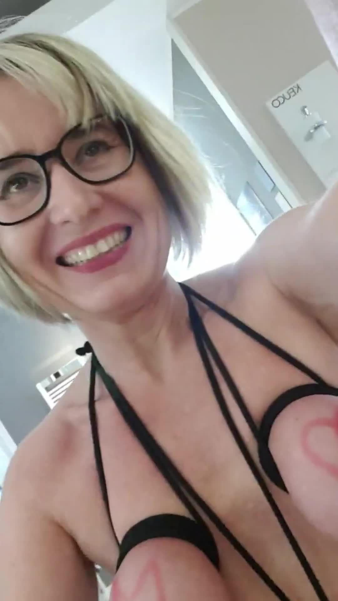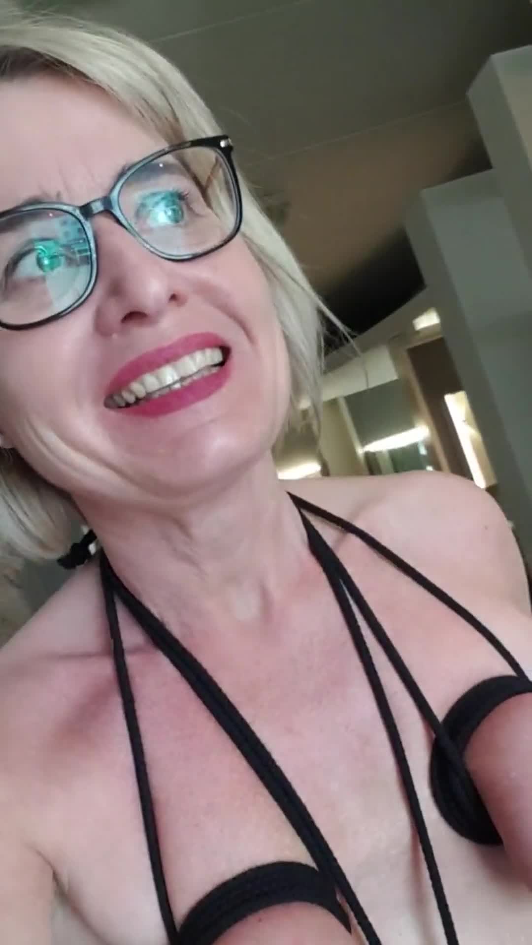 Симпатичная пожилая женщина готовится пойти за покупками, засунув металлический шарик в свою киску и стянув сиськи веревкой перед выходом на улицу.