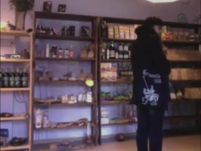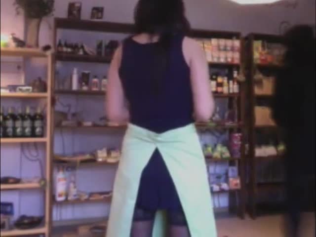 Продавщица в маленьком магазине тайно засовывает яблоко в киску перед веб-камерой, обслуживая покупателя.