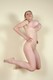 Красотка с большими сиськами и бритой киской прыгает, делает мостик и позирует на кровати.