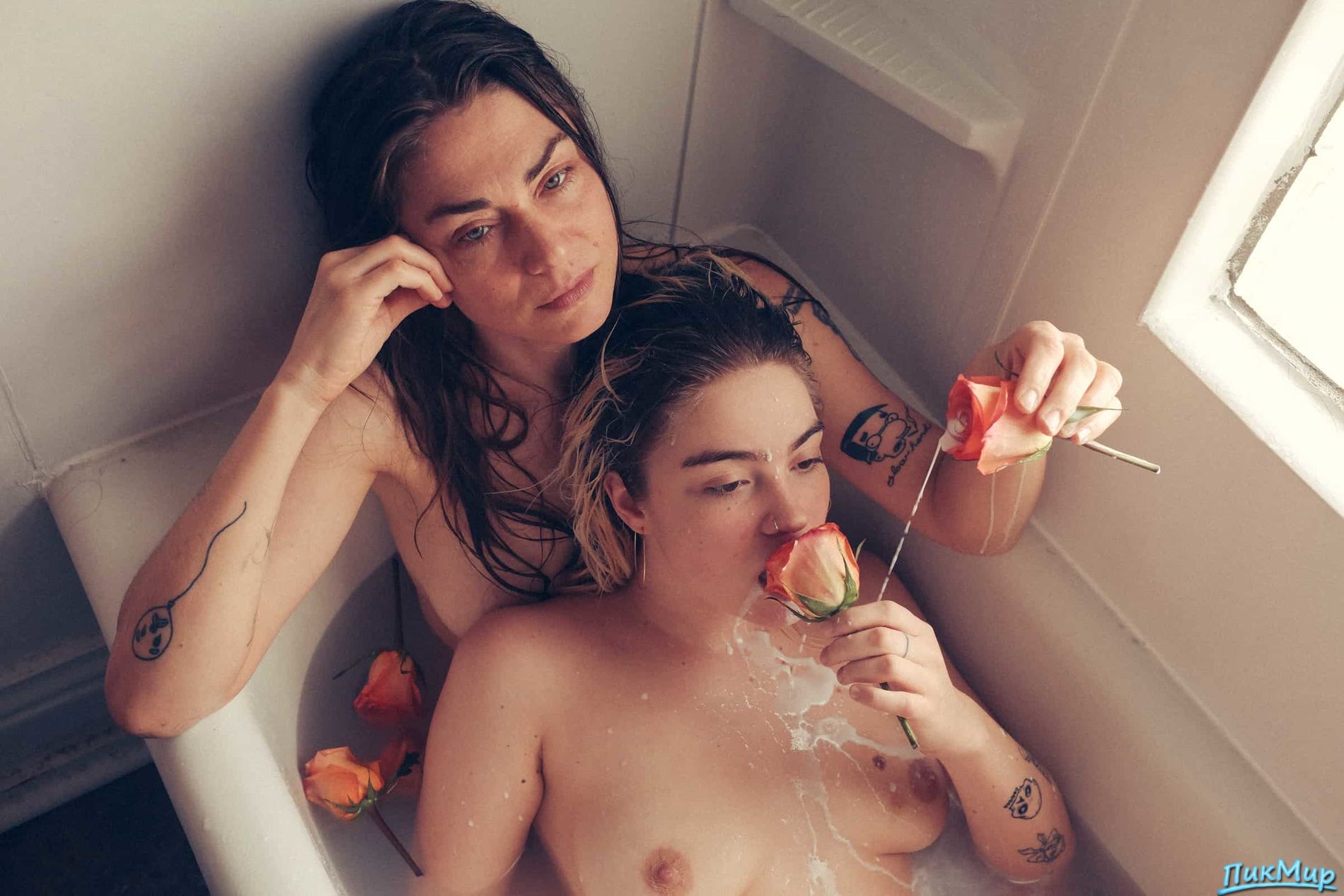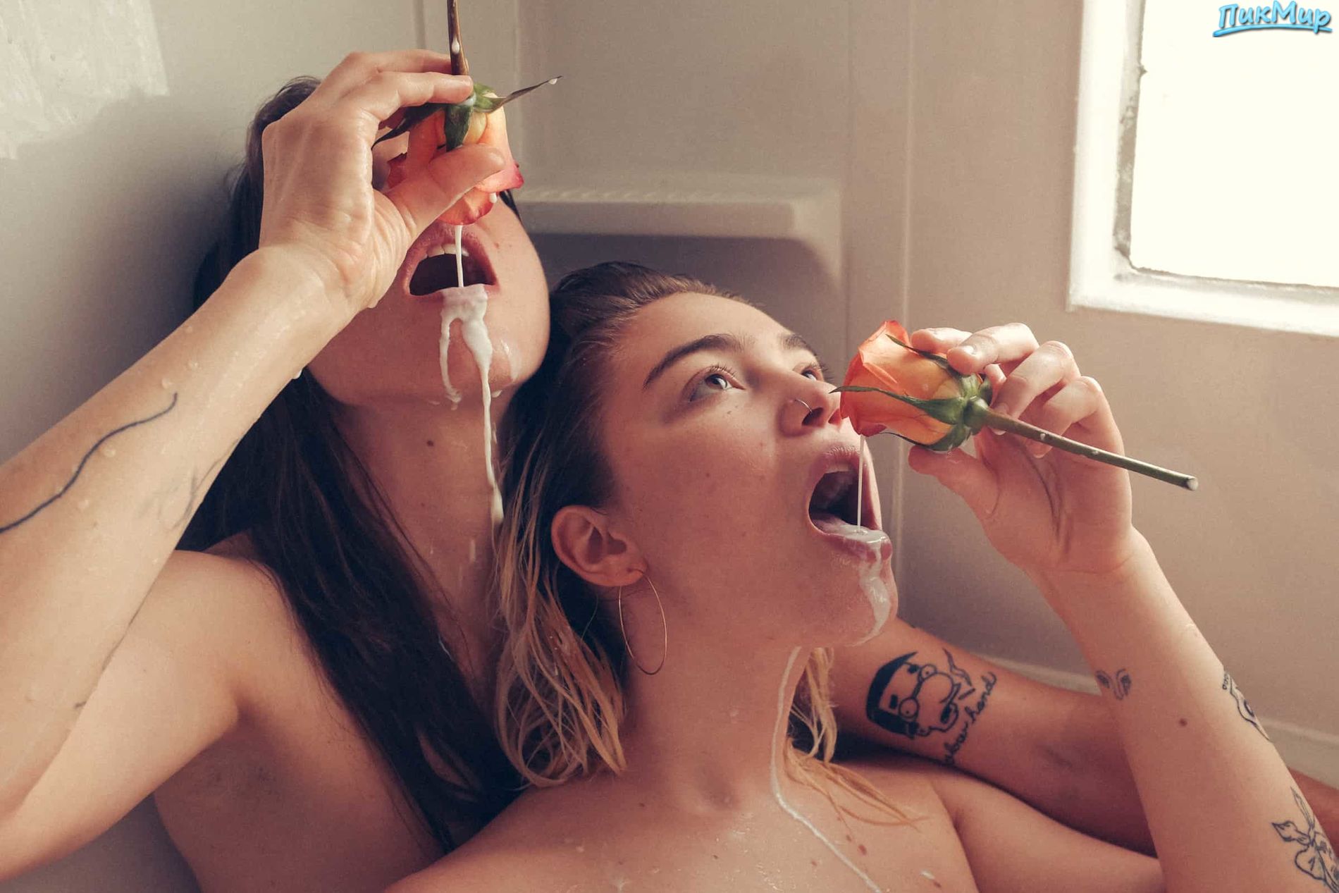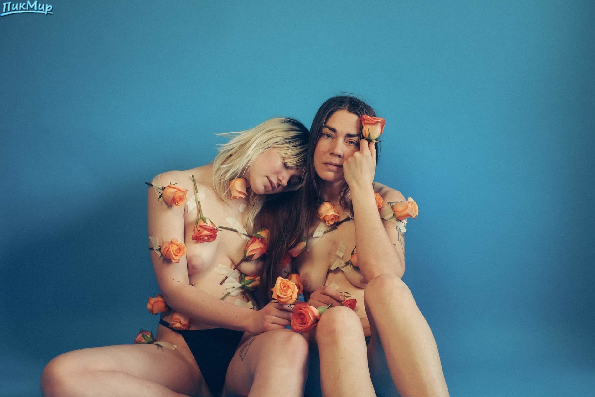 две веселые девушки устроили эротическую фотосессию с налепленными на них цветами, в ванне, полной молока и в длинных носках.Попробуйте понять, в чем их посыл.Я не понял.