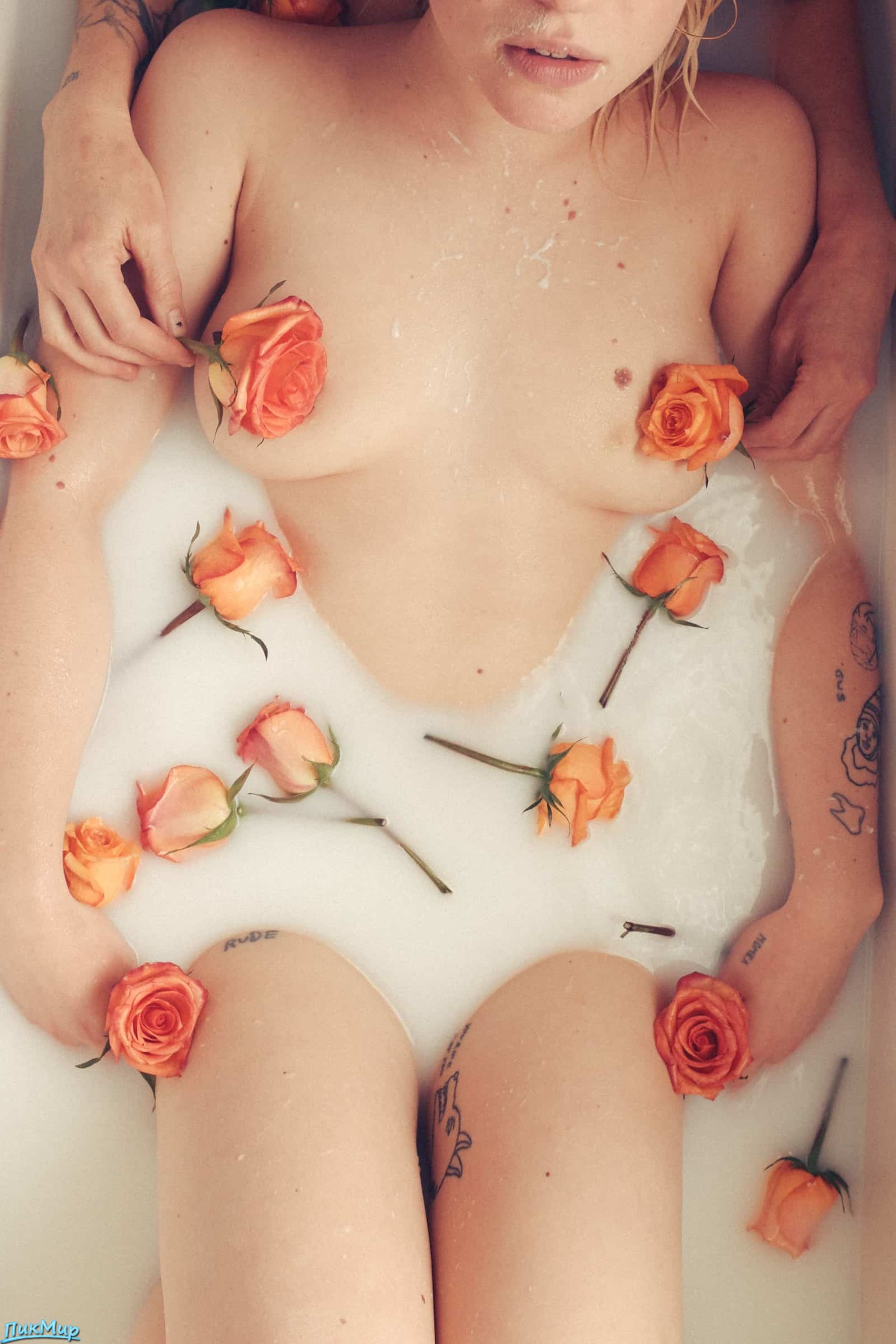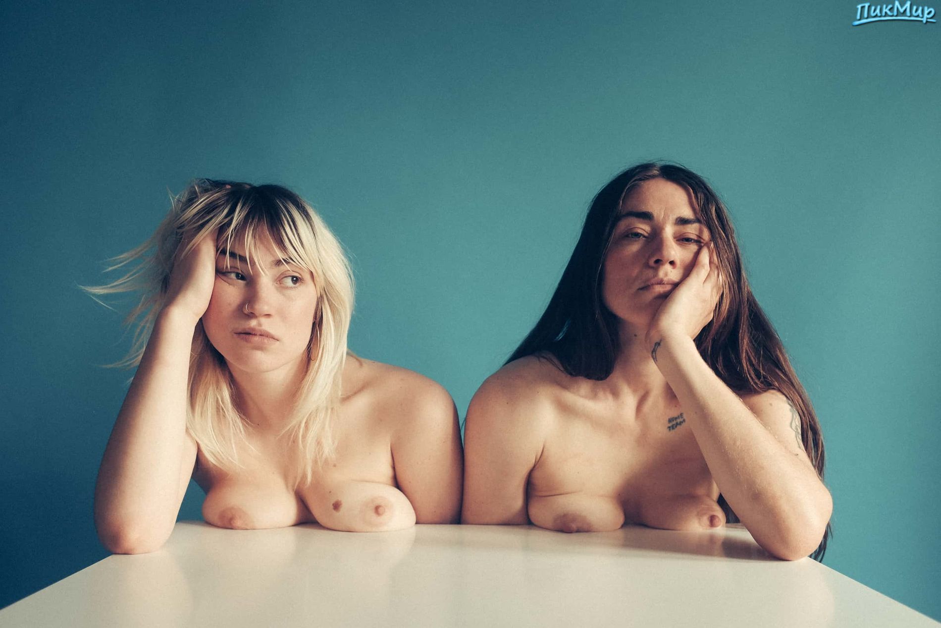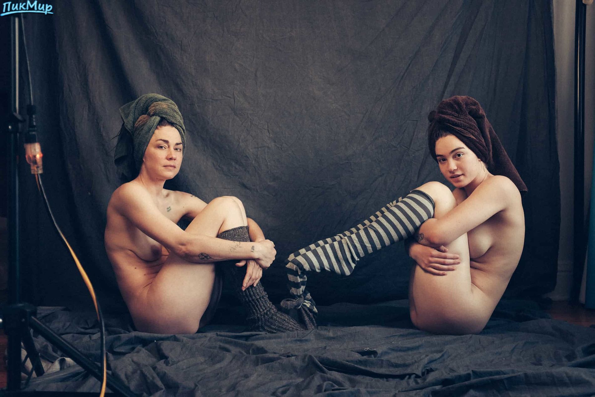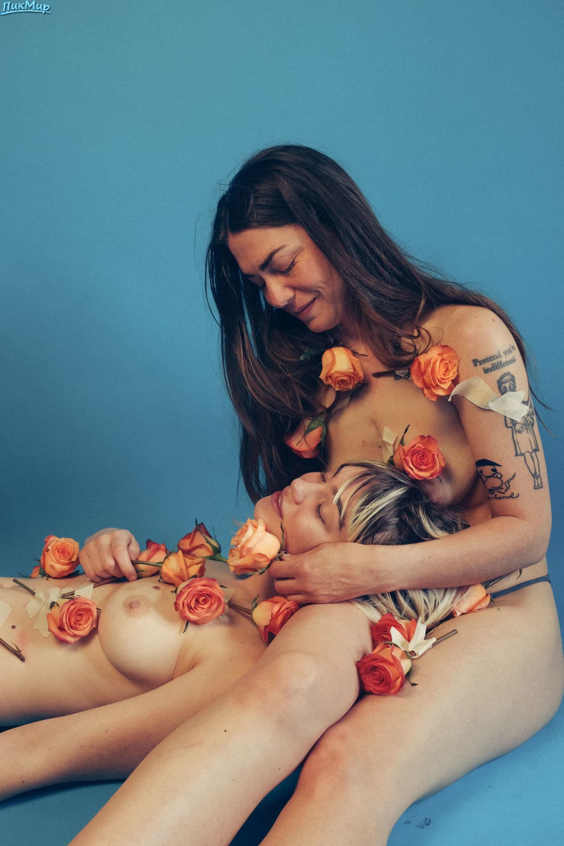 две веселые девушки устроили эротическую фотосессию с налепленными на них цветами, в ванне, полной молока и в длинных носках.Попробуйте понять, в чем их посыл.Я не понял.