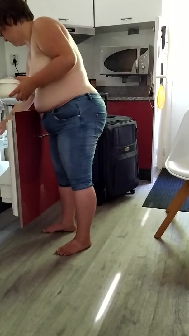 Зрелая женщина с большим животом ходит по дому без лифчика