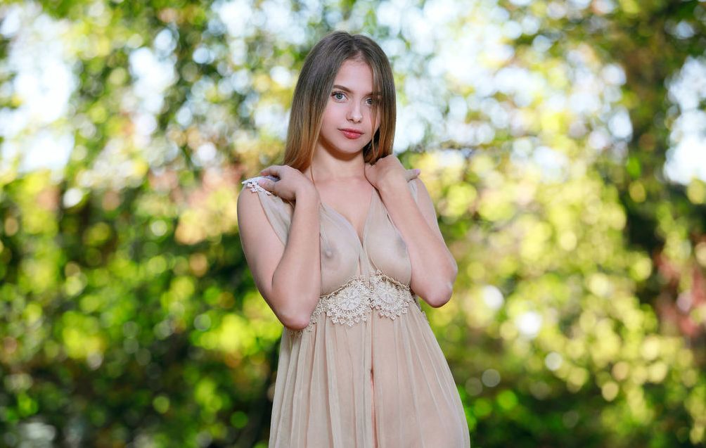Симпатичная тинка демонстрирует свою гладкую киску возле ручья в лесу